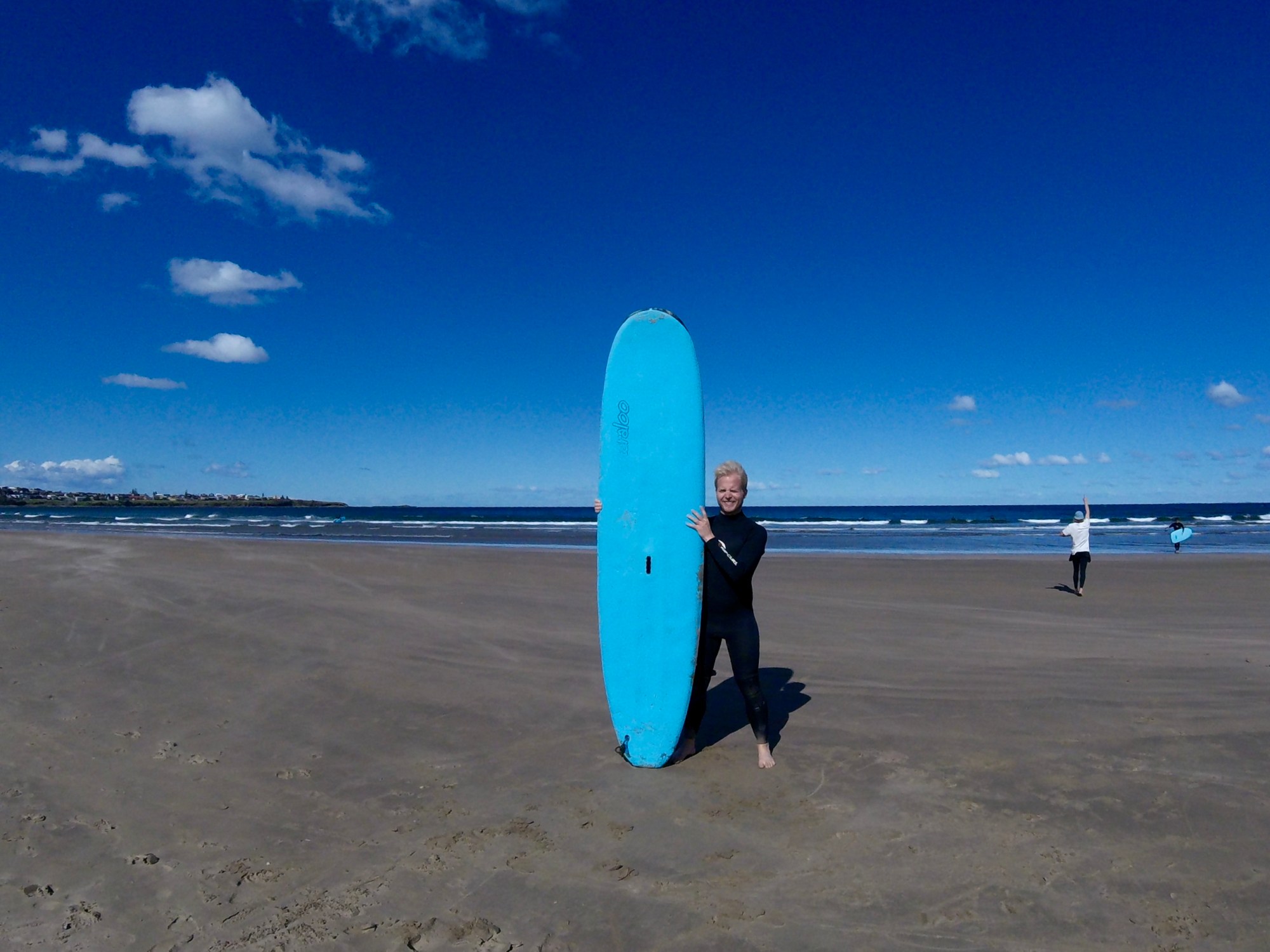 After getting some breakfast and a cold wetsuit, we went to the beach. At the beach we got a surf board each, and some dry land training. We trained the basics of getting up on the board and riding the wave. After about half an hour, we could finally get in the water. Although it seemed hard in the beginning, almost everyone managed to stand up on the board, some longer than others. 🙂